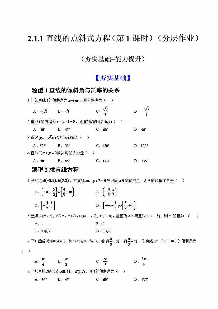2.1.1倾斜角与斜率(分层作业)(原卷版)-人教A版2019选择性必修第一册)
