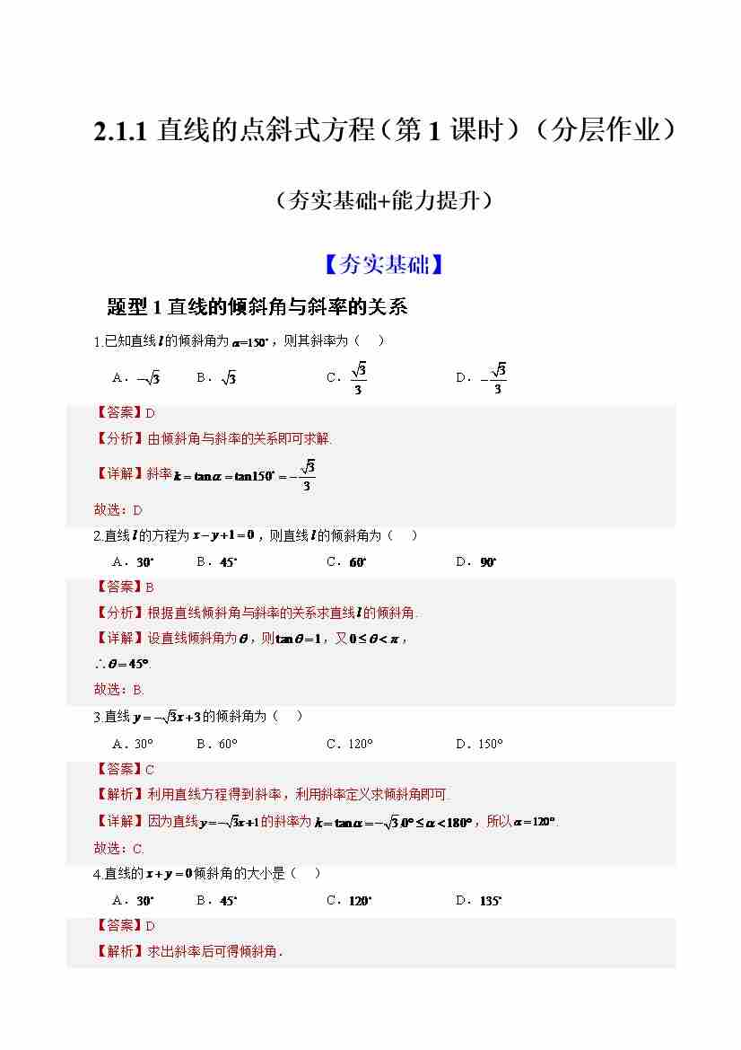 2.1.1倾斜角与斜率(分层作业)(解析版)-人教A版2019选择性必修第一册)