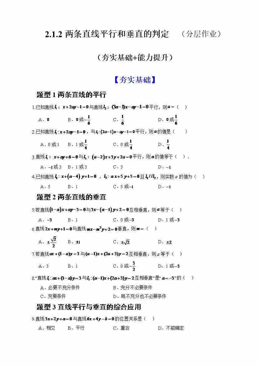 2.1.2两条直线平行和垂直的判定(分层作业)(原卷版)-人教A版2019选择性必修第一册)