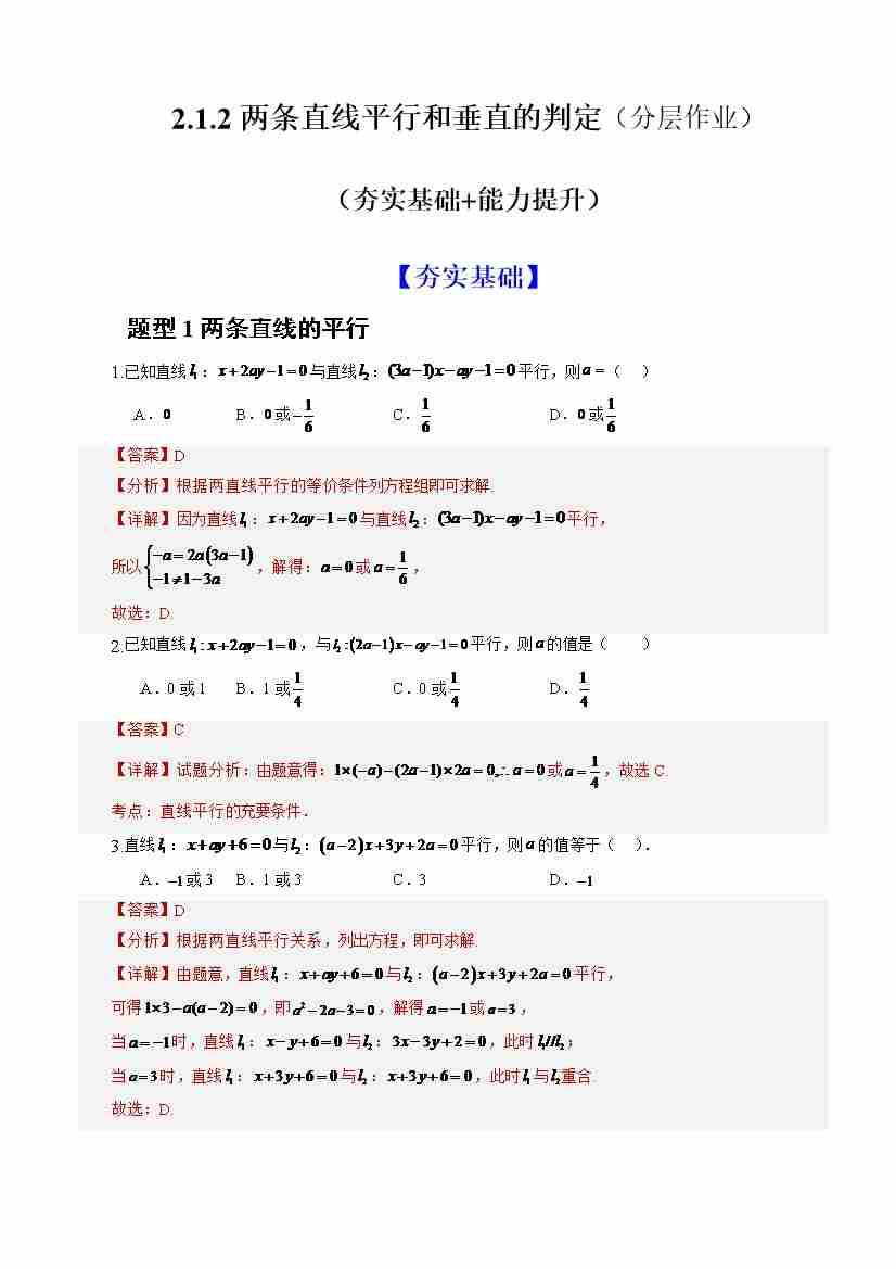 2.1.2两条直线平行和垂直的判定(分层作业)(解析版)-人教A版2019选择性必修第一册)