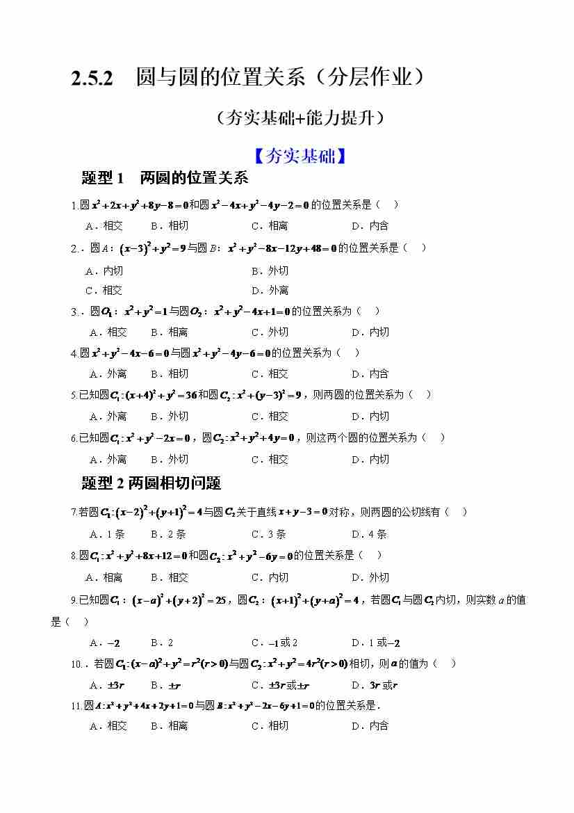 2.5.2 圆与圆的位置关系(分层作业)(原卷版)-人教A版2019选择性必修第一册)