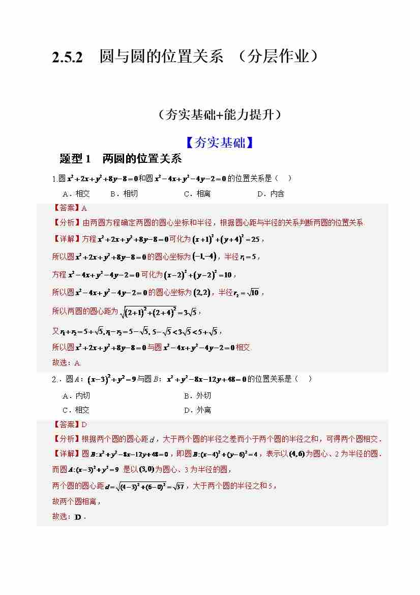 2.5.2 圆与圆的位置关系(分层作业)(解析版)-人教A版2019选择性必修第一册)