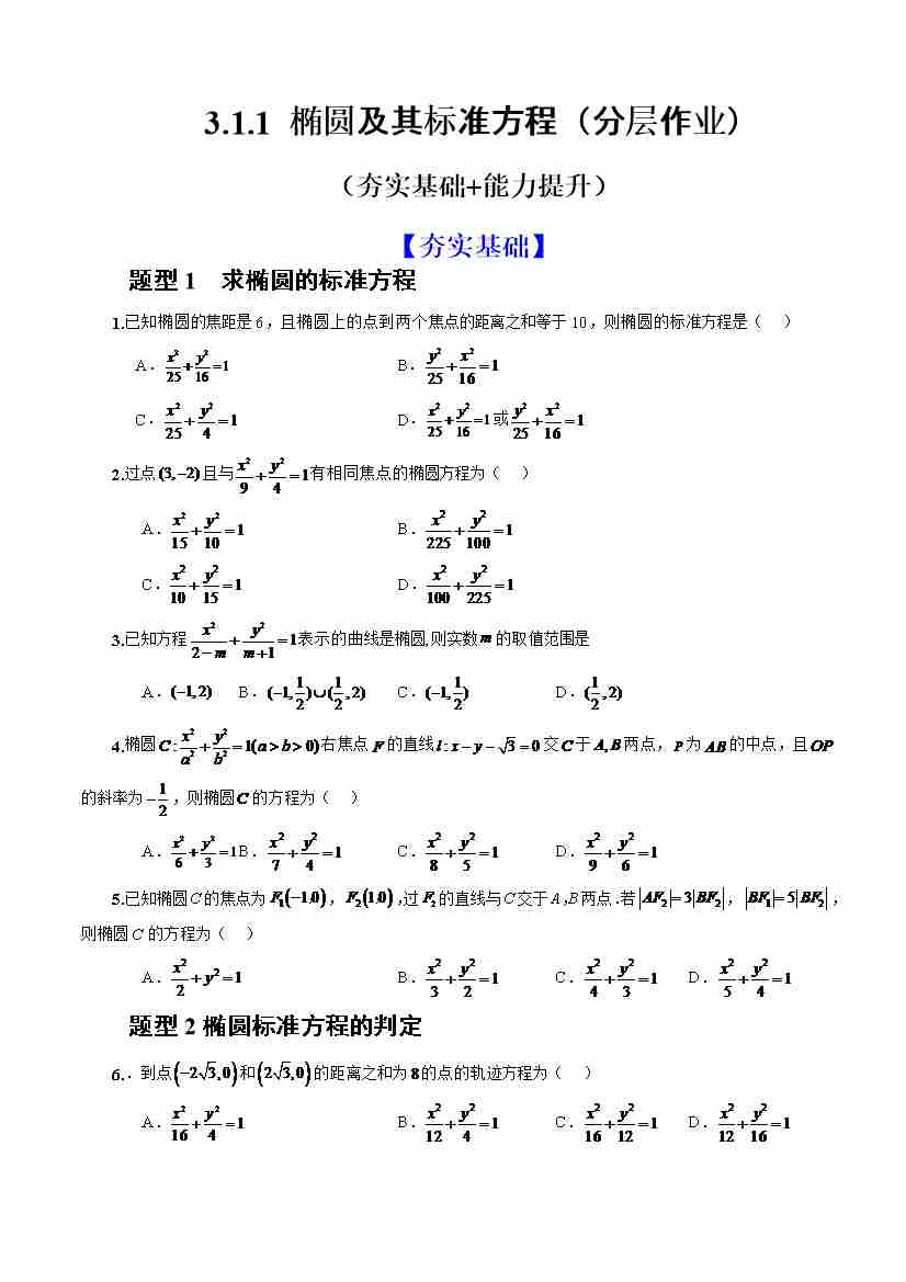 3.1.1 椭圆及其标准方程 (分层作业)(原卷版)-人教A版2019选择性必修第一册)