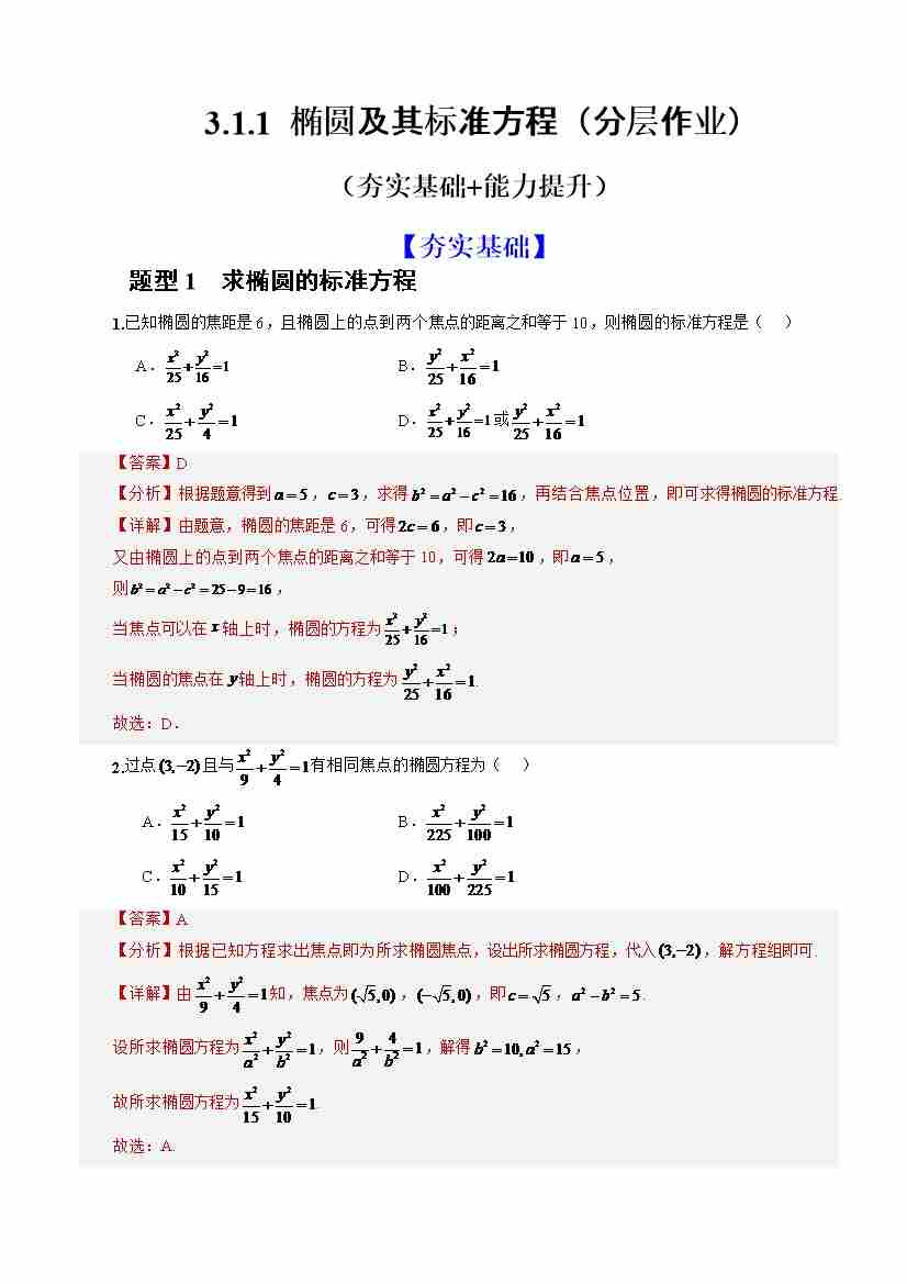 3.1.1 椭圆及其标准方程 (分层作业)(解析版)-人教A版2019选择性必修第一册)