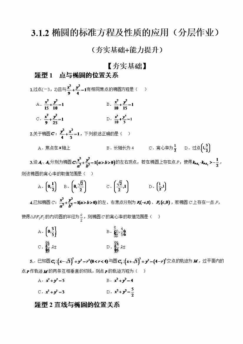 3.1.2椭圆的标准方程及性质的应用(分层作业)(原卷版)-人教A版2019选择性必修第一册)