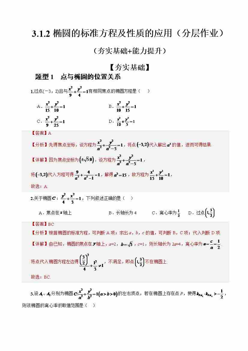 3.1.2椭圆的标准方程及性质的应用(分层作业)(解析版)-人教A版2019选择性必修第一册)