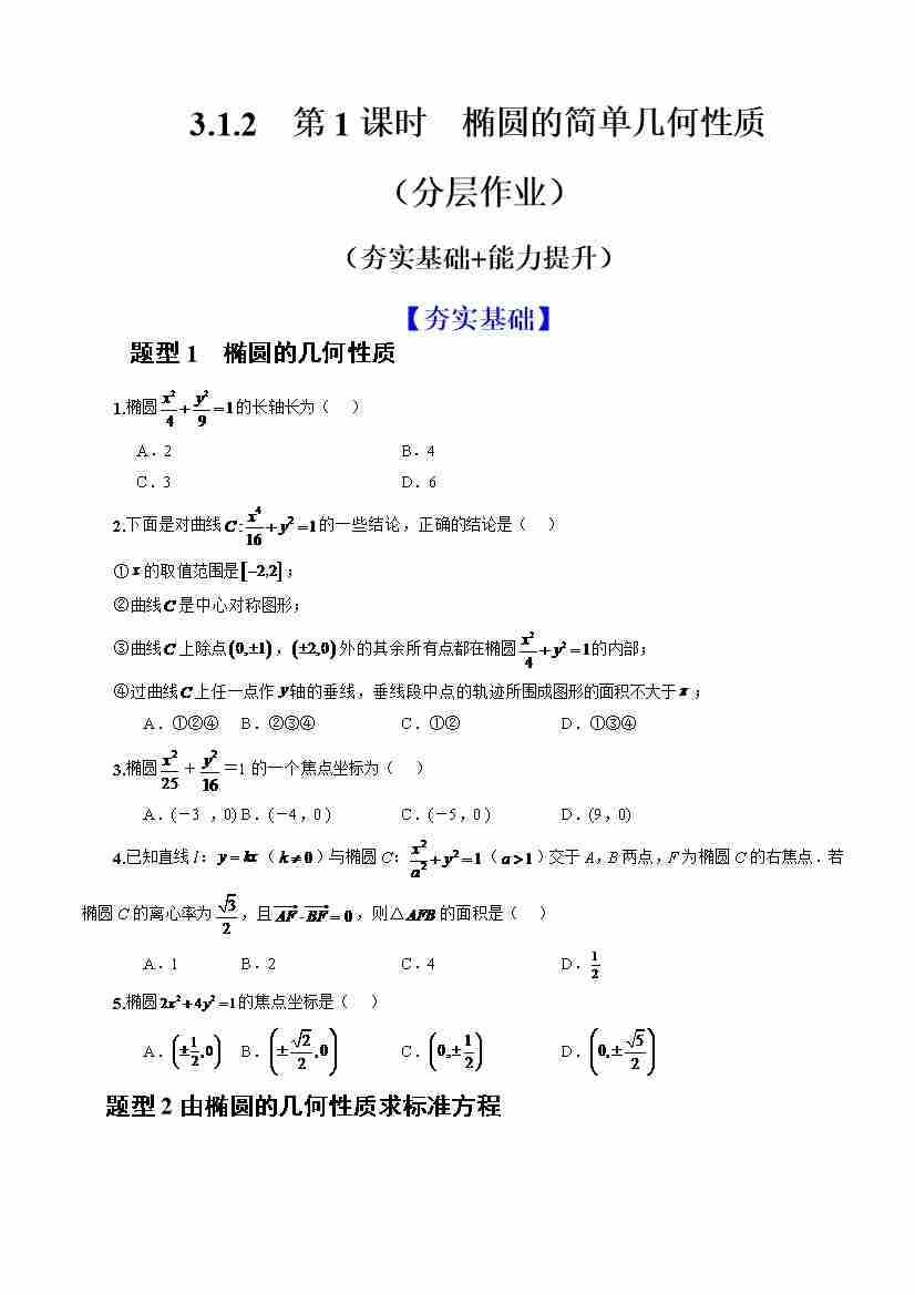 3.1.2椭圆的简单几何性质(分层作业)(原卷版)-人教A版2019选择性必修第一册)