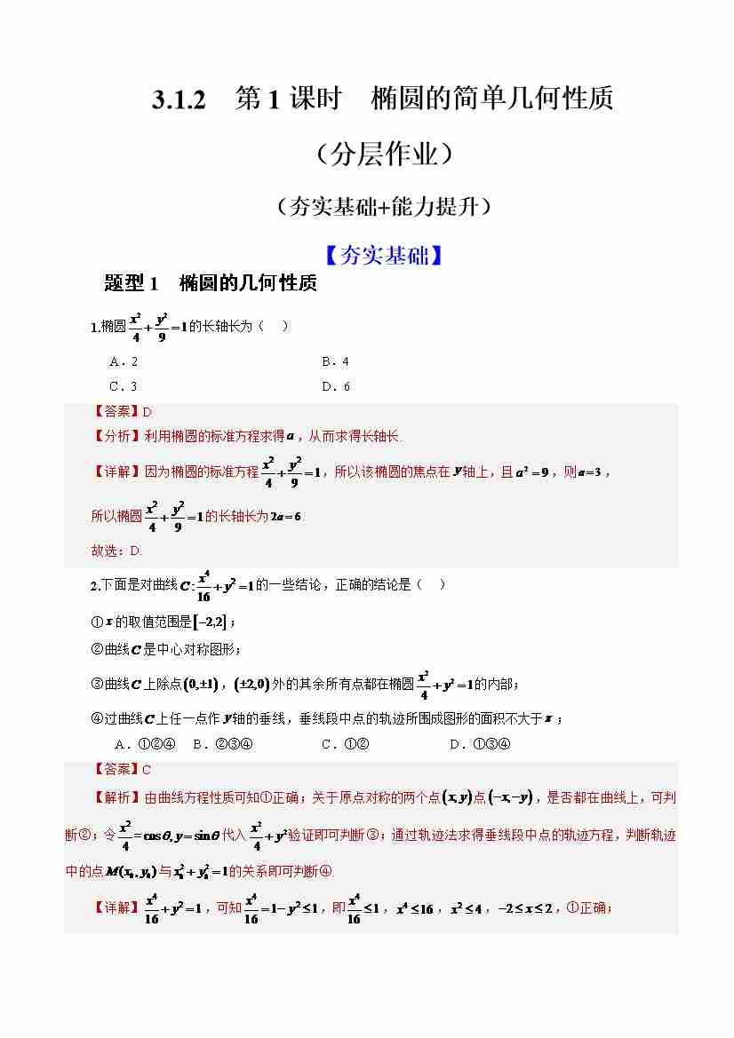 3.1.2椭圆的简单几何性质(分层作业)(解析版)-人教A版2019选择性必修第一册)