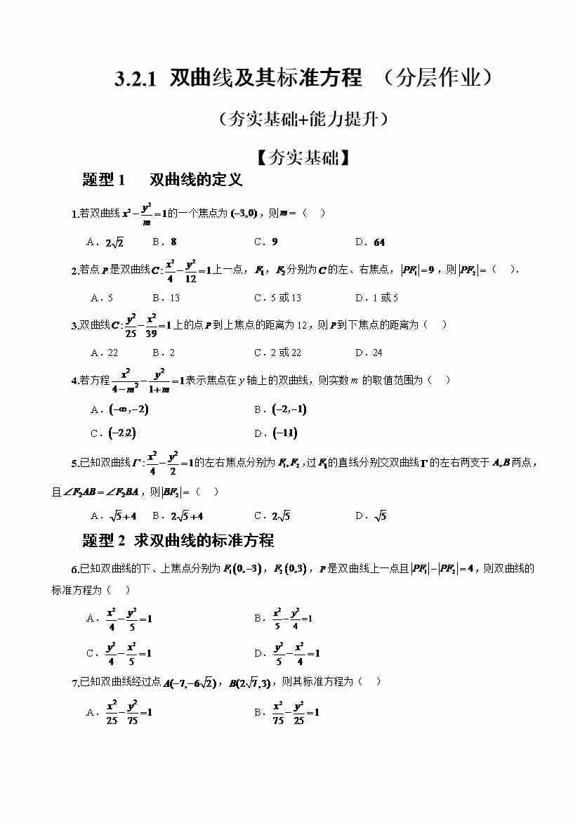 3.2.1双曲线及其标准方程(分层作业)(原卷版)-人教A版2019选择性必修第一册)