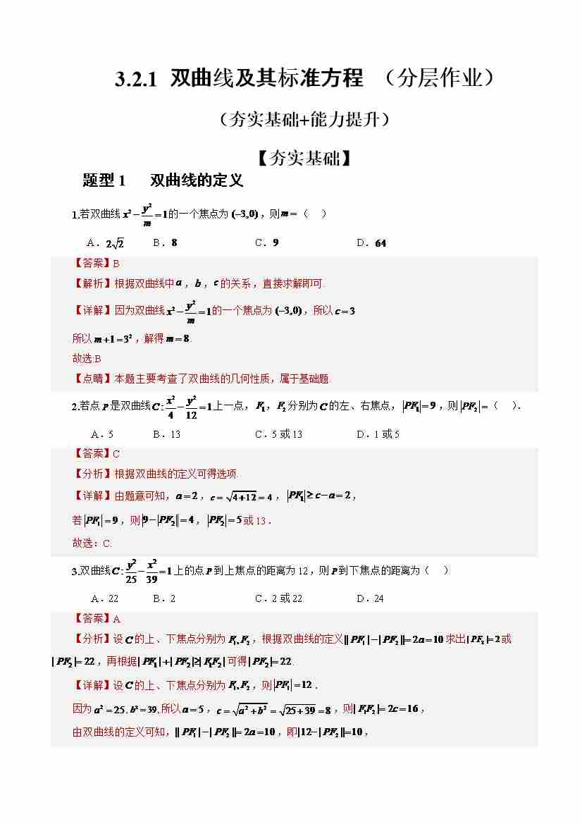 3.2.1双曲线及其标准方程(分层作业)(解析版)-人教A版2019选择性必修第一册)