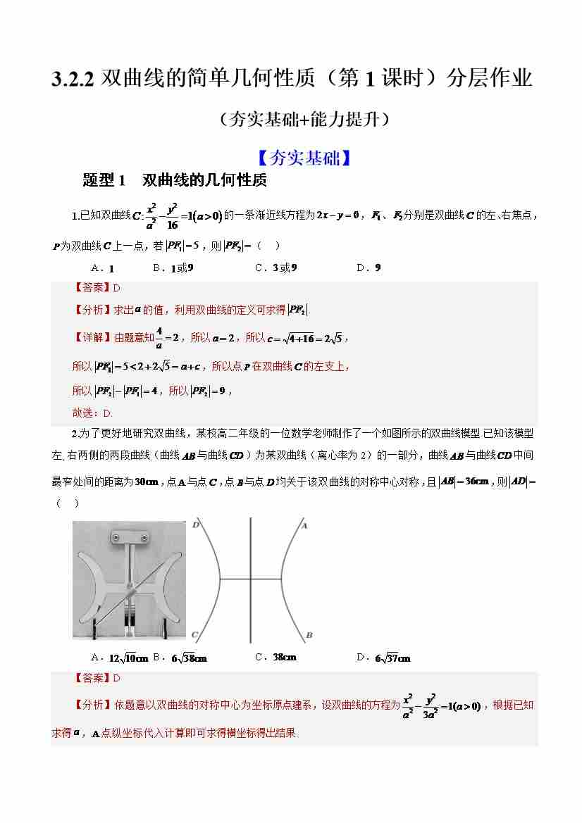 3.2.2 第1课时 双曲线的简单几何性质 (分层作业)(解析版)-人教A版2019选择性必修第一册)