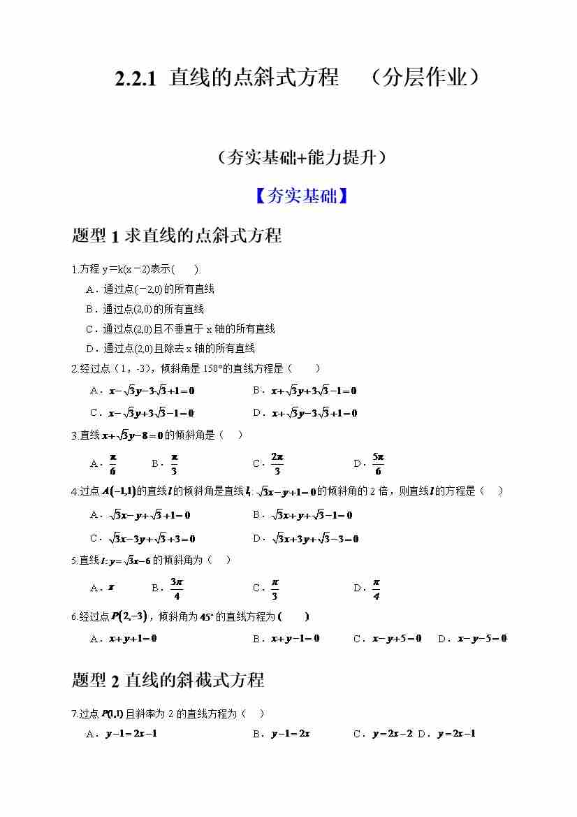 2.2.1直线的点斜式方程(分层作业)(原卷版)-人教A版2019选择性必修第一册)