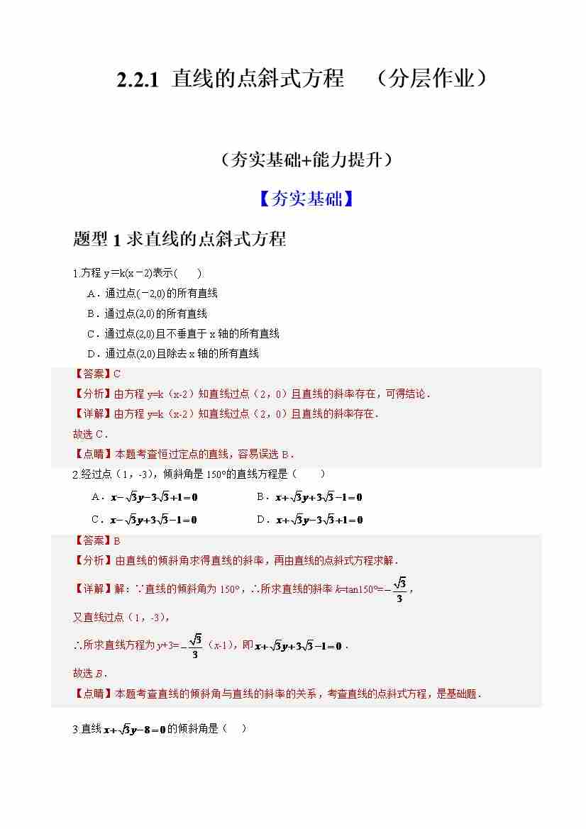 2.2.1直线的点斜式方程(分层作业)(解析版)-人教A版2019选择性必修第一册)