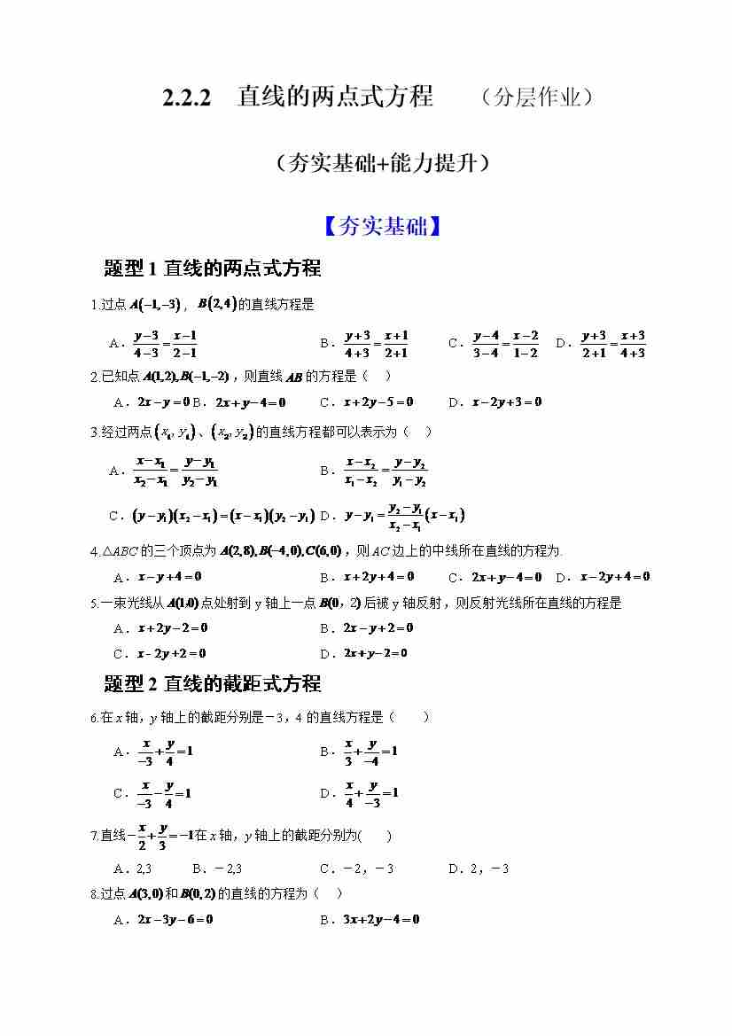 2.2.2直线的两点式方程(分层作业)(原卷版)-人教A版2019选择性必修第一册)
