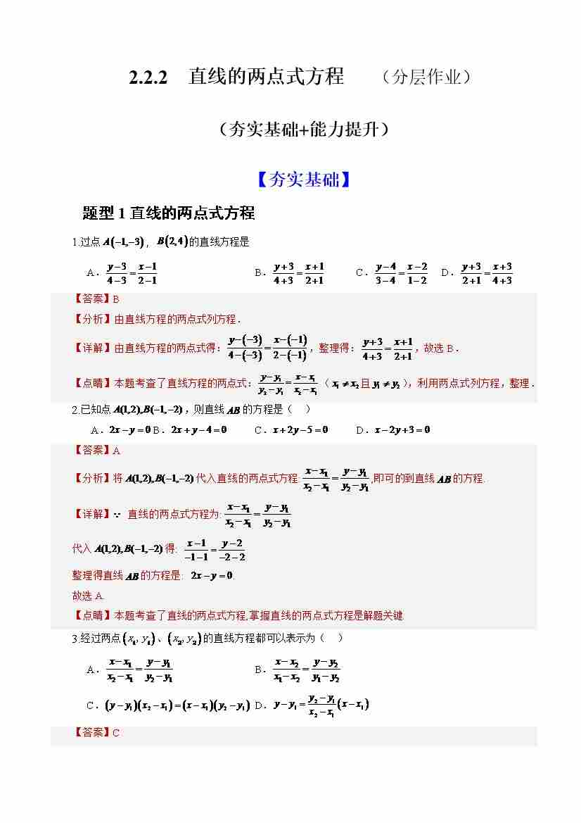 2.2.2直线的两点式方程(分层作业)(解析版)-人教A版2019选择性必修第一册)