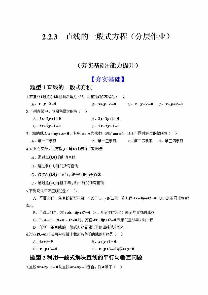 2.2.3直线的一般式方程(分层作业)(原卷版)-人教A版2019选择性必修第一册)