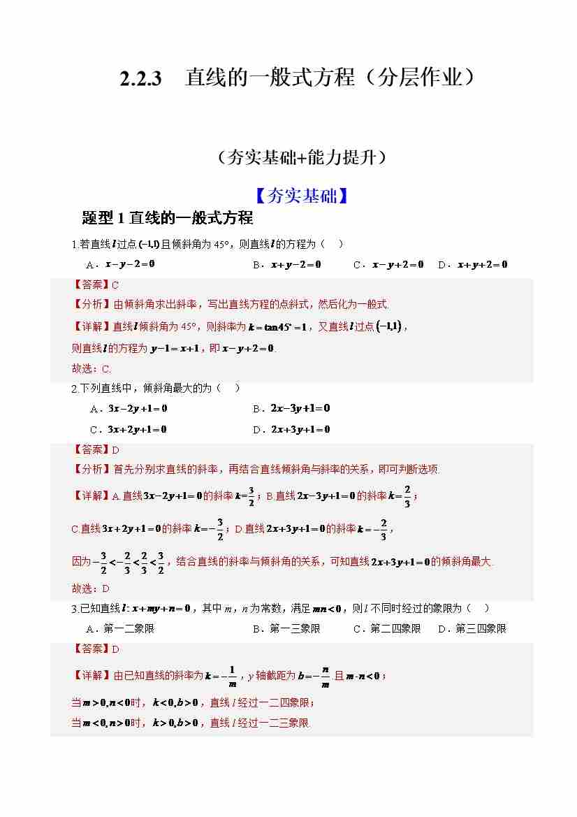 2.2.3直线的一般式方程(分层作业)(解析版)-人教A版2019选择性必修第一册)