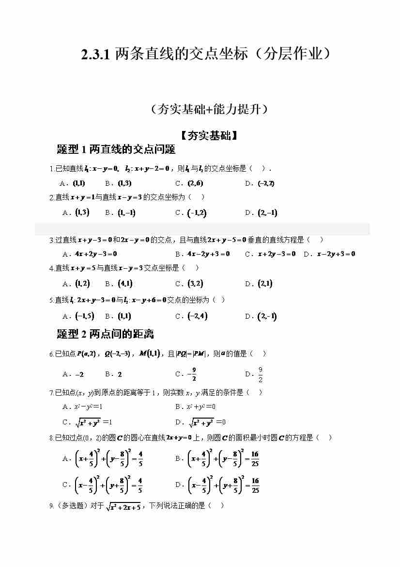 2.3.1两条直线的交点坐标(分层作业)(原卷版)-人教A版2019选择性必修第一册)