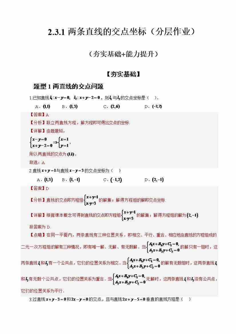 2.3.1两条直线的交点坐标(分层作业)(解析版)-人教A版2019选择性必修第一册)