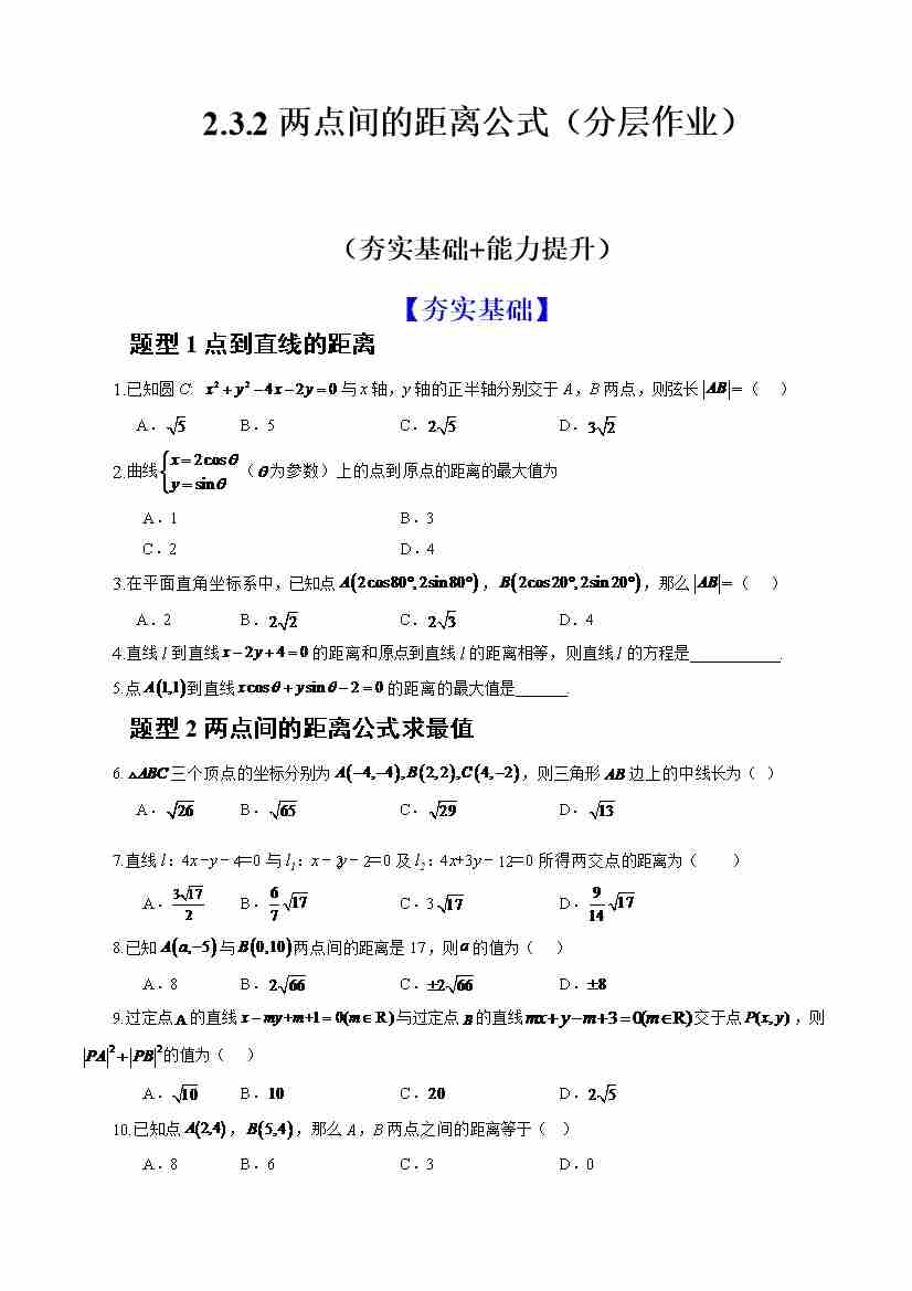 2.3.2两点间的距离公式 (分层作业)(原卷版)-人教A版2019选择性必修第一册)
