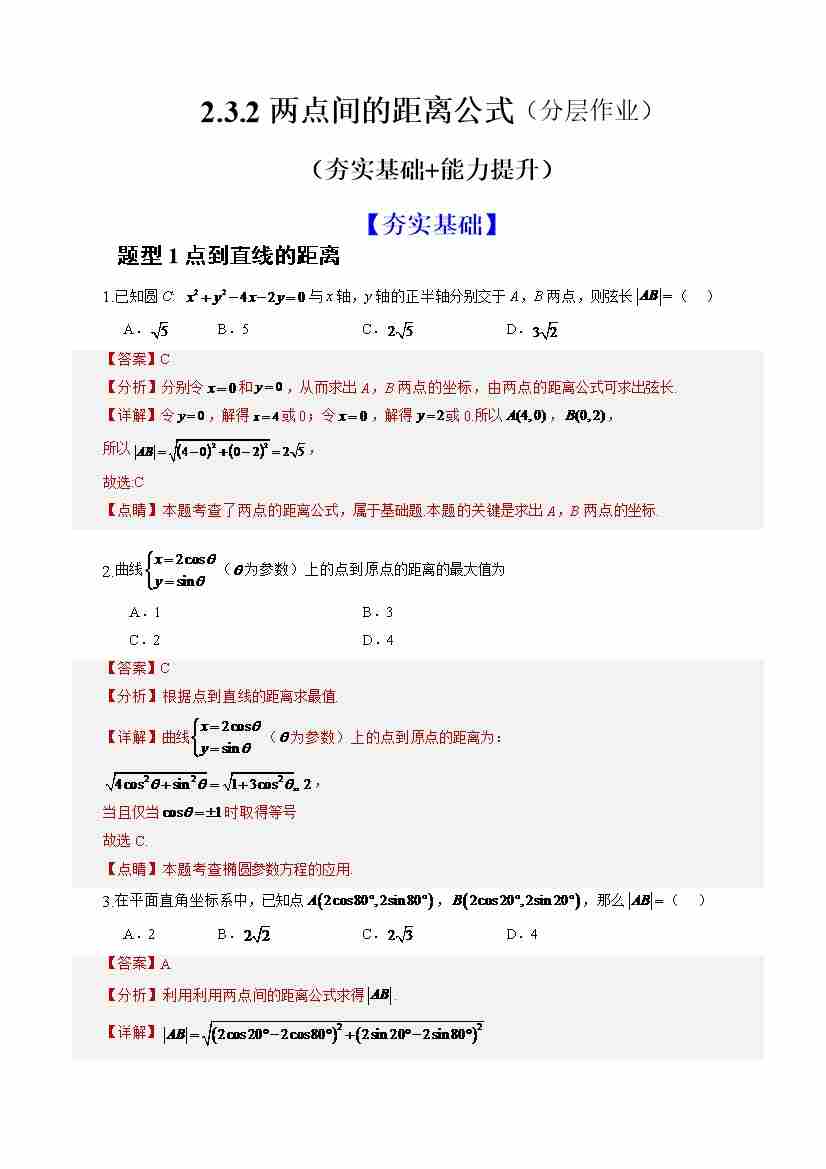 2.3.2两点间的距离公式 (分层作业)(解析版)-人教A版2019选择性必修第一册)