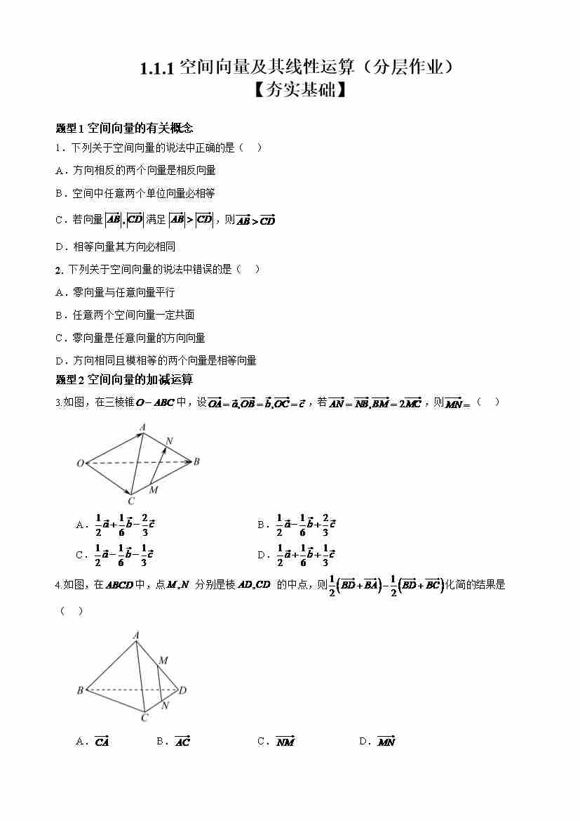 1.1.1空间向量及其线性运算(分层作业)(原卷版)-人教A版2019选择性必修第一册)