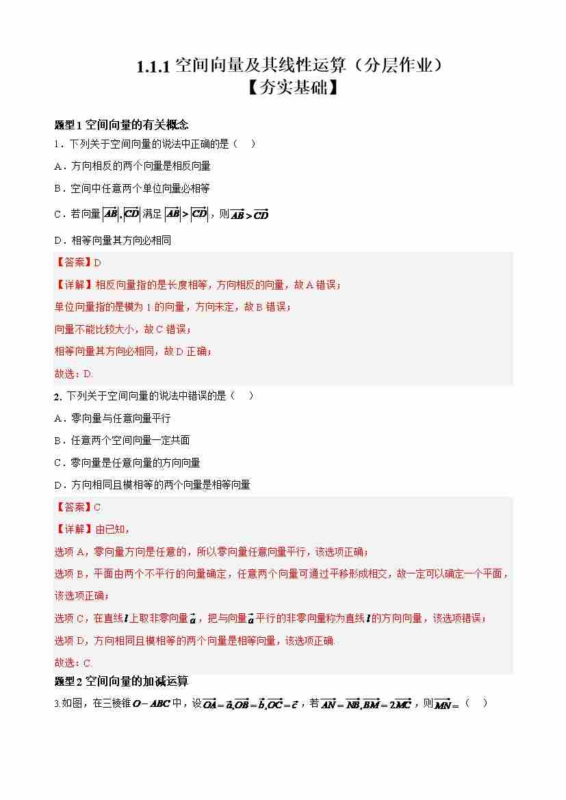 1.1.1空间向量及其线性运算(分层作业)(解析版)-人教A版2019选择性必修第一册)