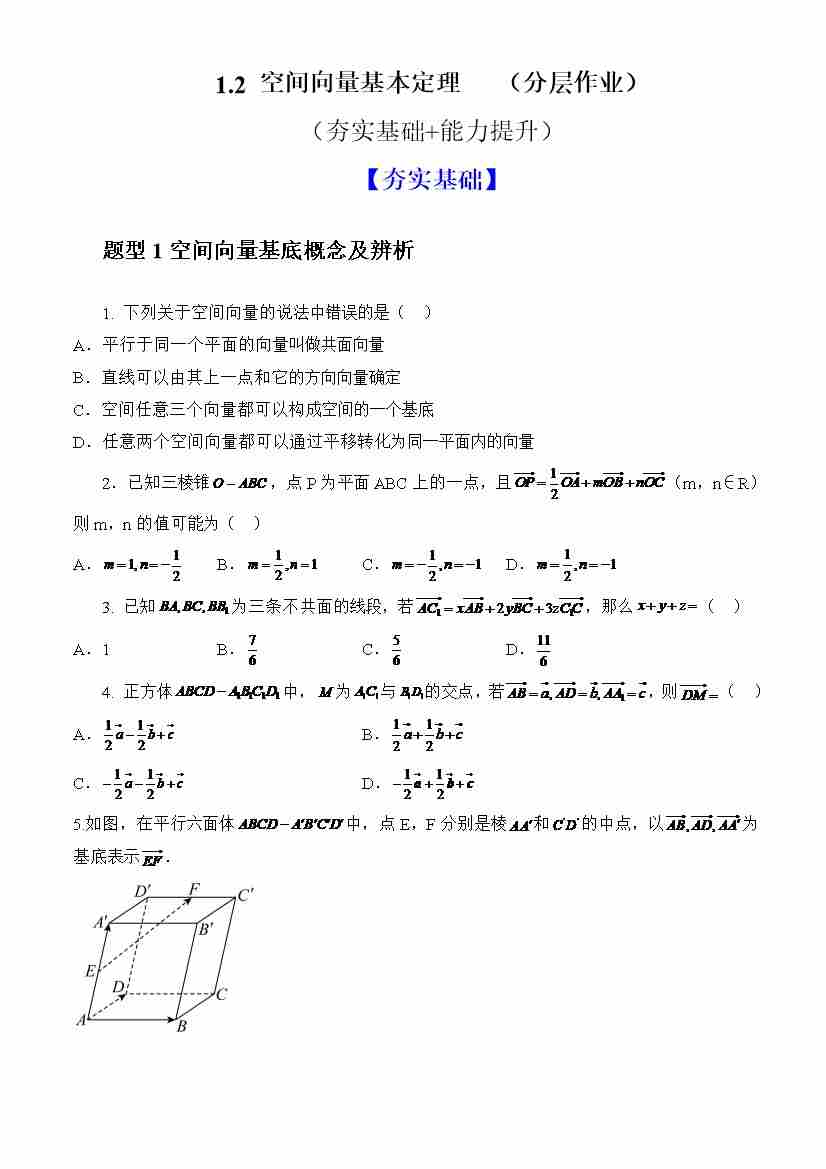1.2 空间向量基本定理(分层作业)(原卷版)-人教A版2019选择性必修第一册)