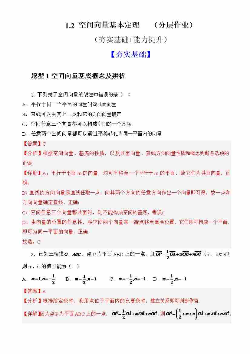 1.2 空间向量基本定理(分层作业)(解析版)-人教A版2019选择性必修第一册)