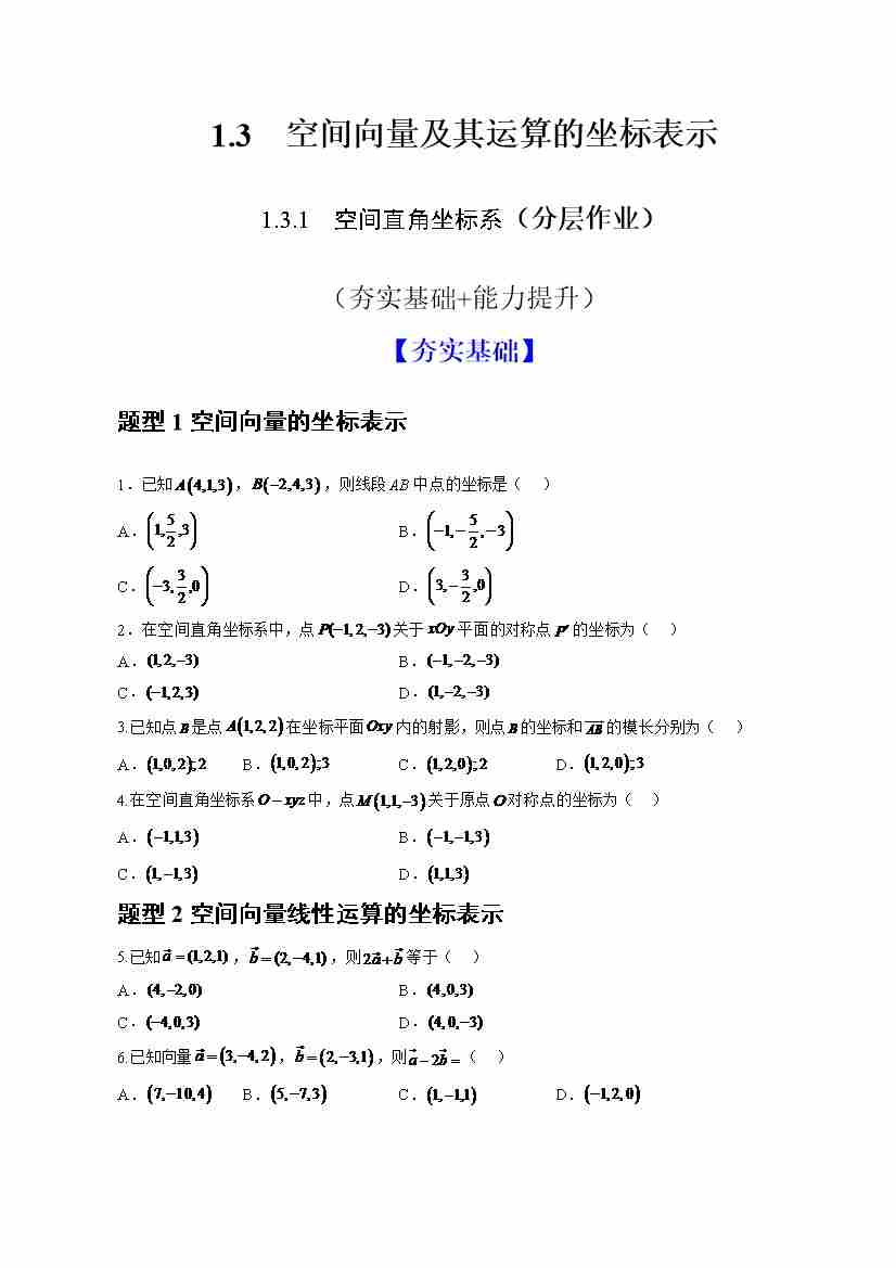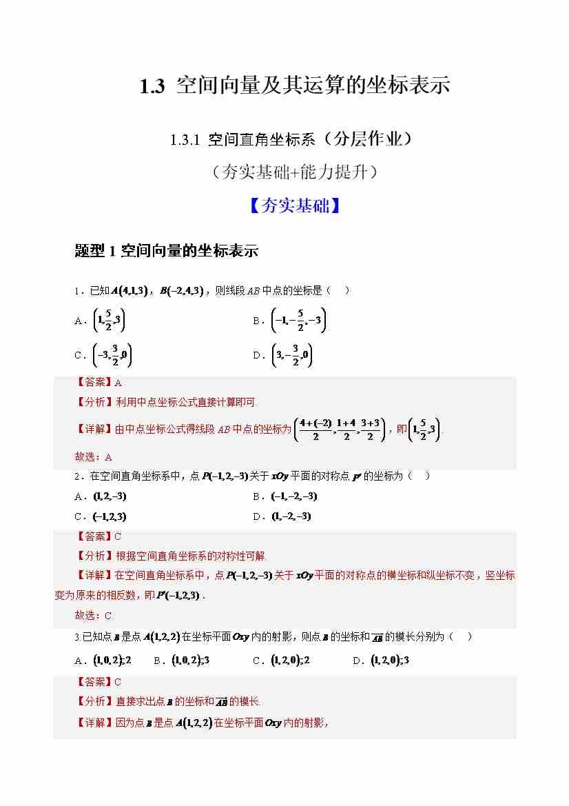 1.3.1空间直角坐标系(分层作业) 解析版 -人教A版2019选择性必修第一册)