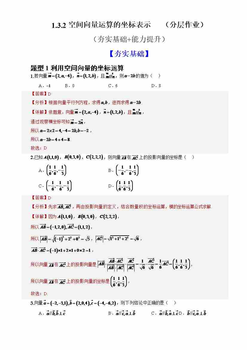 1.3.2空间向量运算的坐标表示(分层作业)(解析版)-人教A版2019选择性必修第一册)
