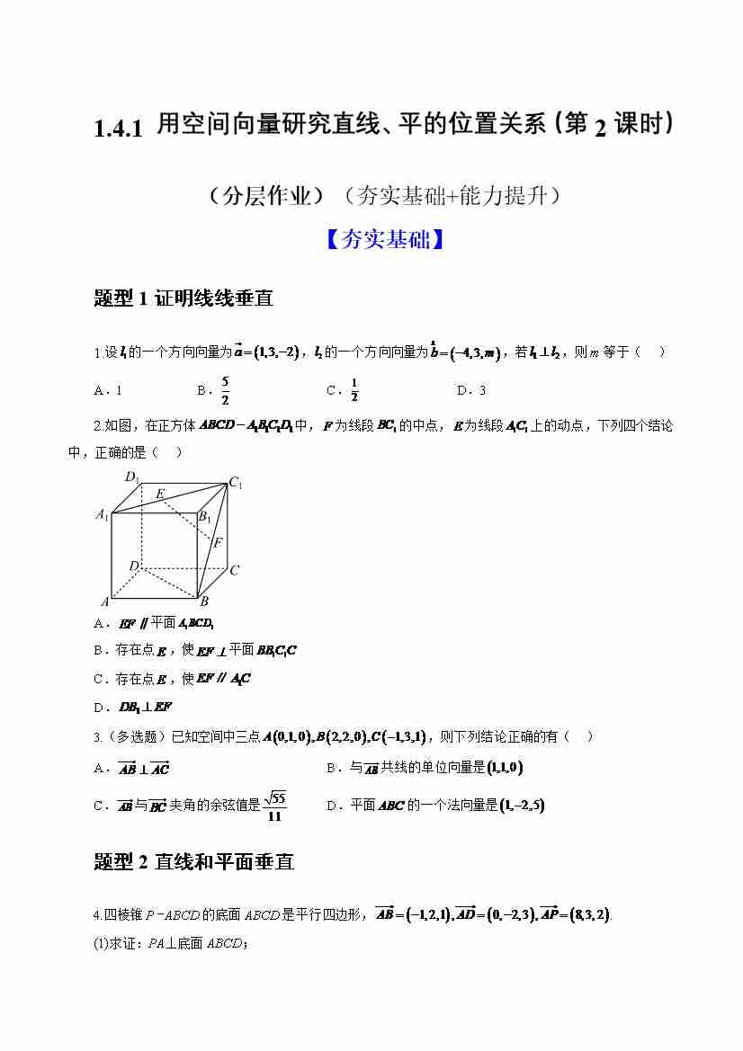 1.4.1 用空间向量研究直线、平的位置关系(第2课时)(分层作业)(原卷版)-人教A版2019选择性必修第一册)