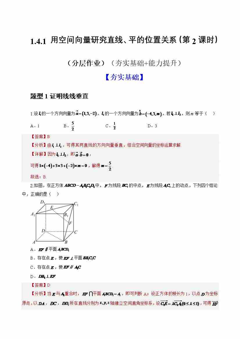 1.4.1 用空间向量研究直线、平的位置关系(第2课时)(分层作业)(解析版)-人教A版2019选择性必修第一册)