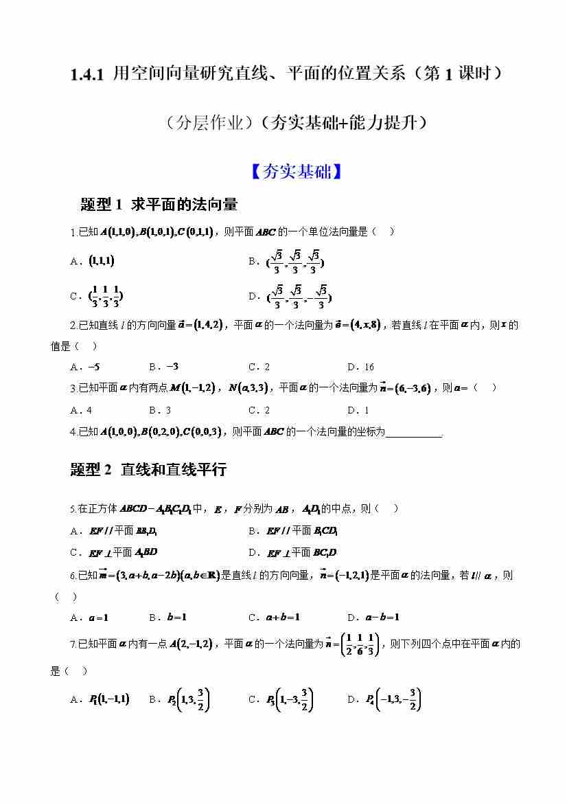 1.4.1用空间向量研究直线、平面的位置关系 (第1课时)(分层作业)(原卷版)-人教A版2019选择性必修第一册)