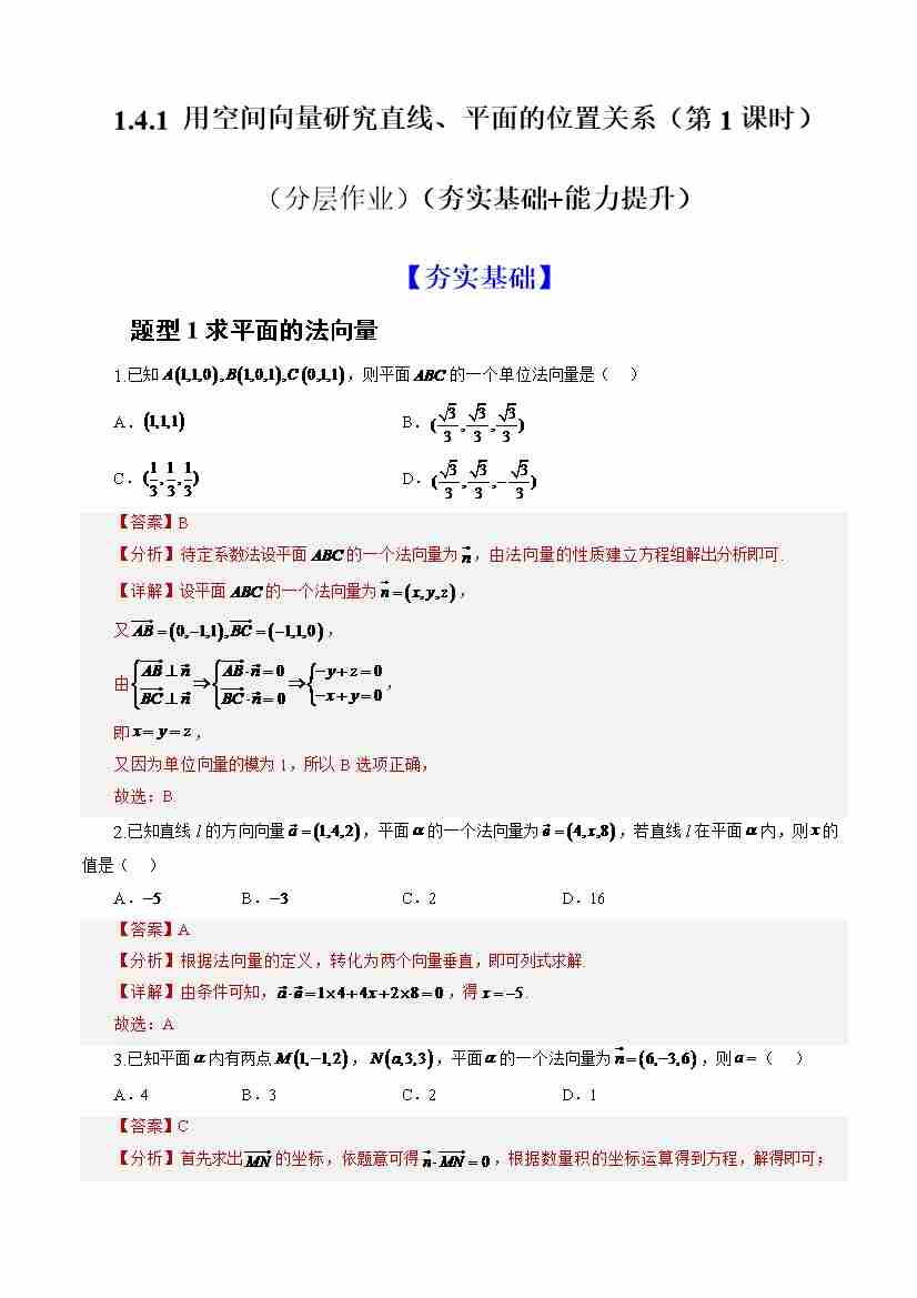 1.4.1用空间向量研究直线、平面的位置关系 (第1课时)(分层作业)(解析版)-人教A版2019选择性必修第一册)