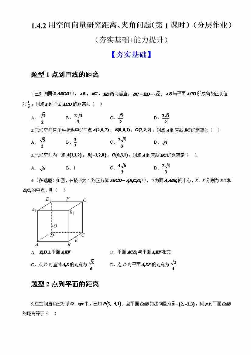 1.4.2用空间向量研究距离、夹角问题(第1课时)(分层作业)(原卷版)-人教A版2019选择性必修第一册)