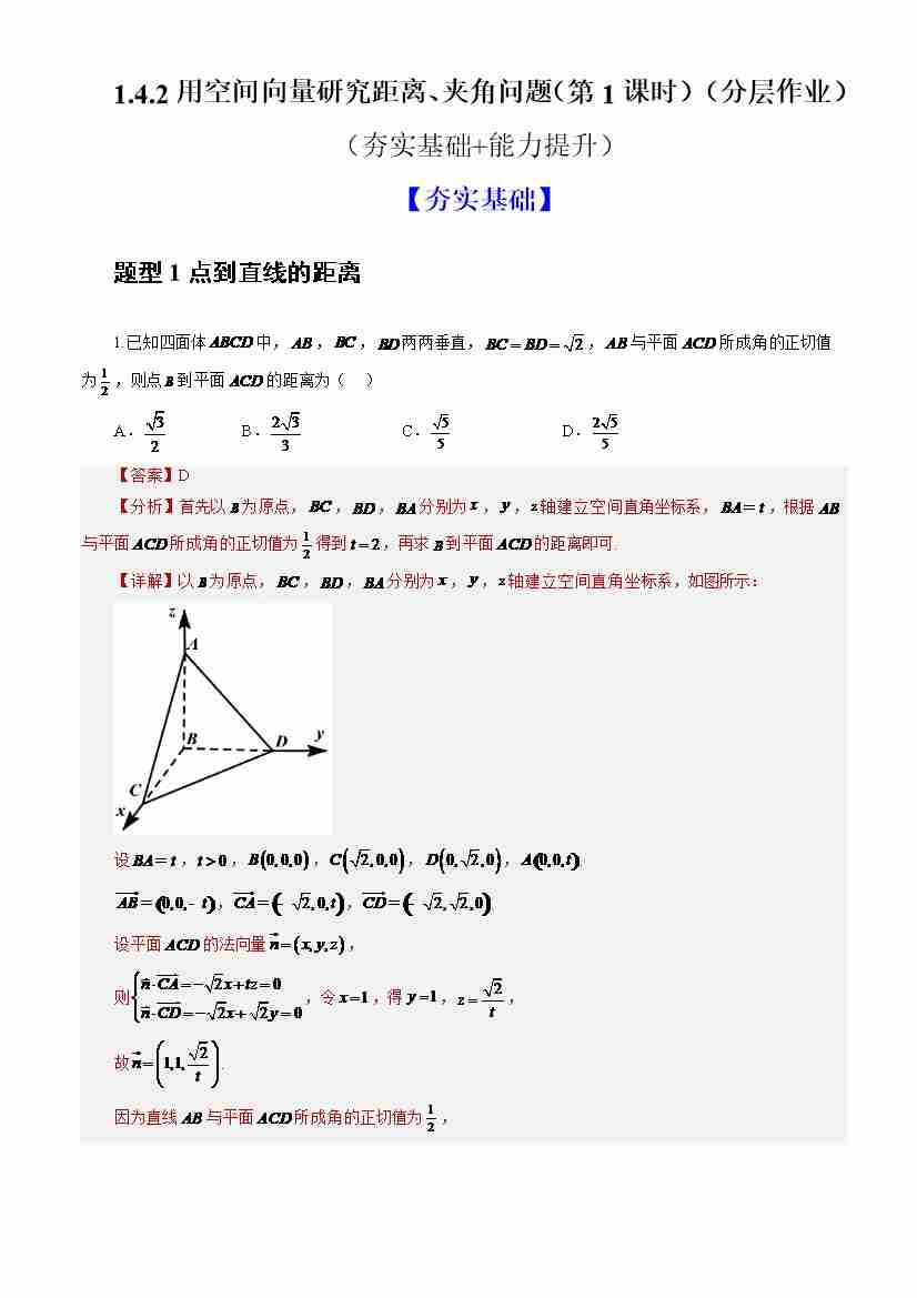 1.4.2用空间向量研究距离、夹角问题(第1课时)(分层作业)(解析版)-人教A版2019选择性必修第一册)