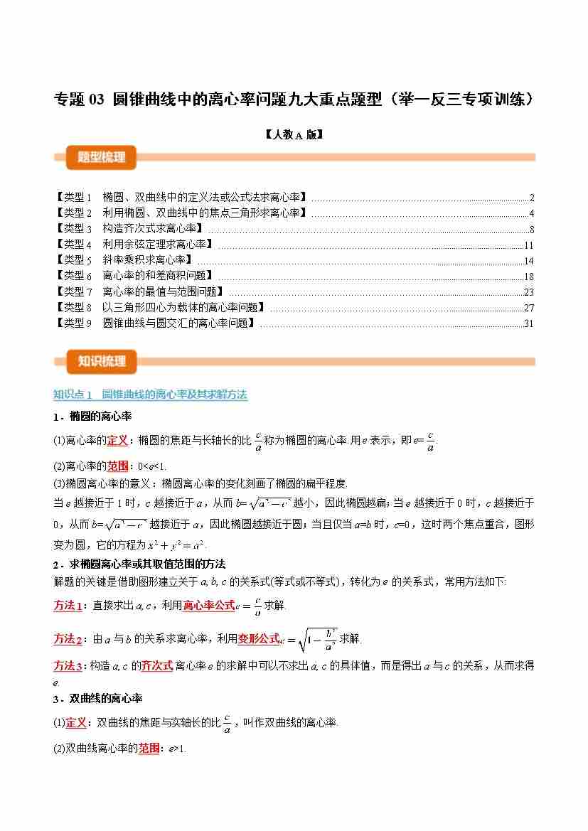 专题03 圆锥曲线中的离心率问题九大重点题型(举一反三专项训练)(教师版)