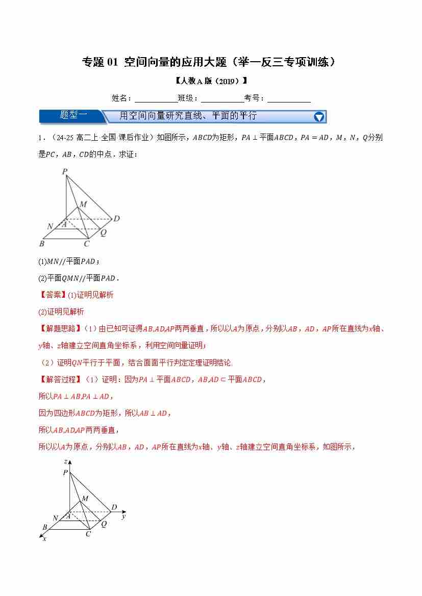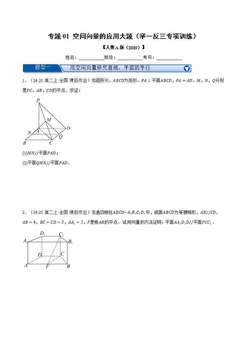 专题01 空间向量的应用大题(举一反三专项训练)(学生版)