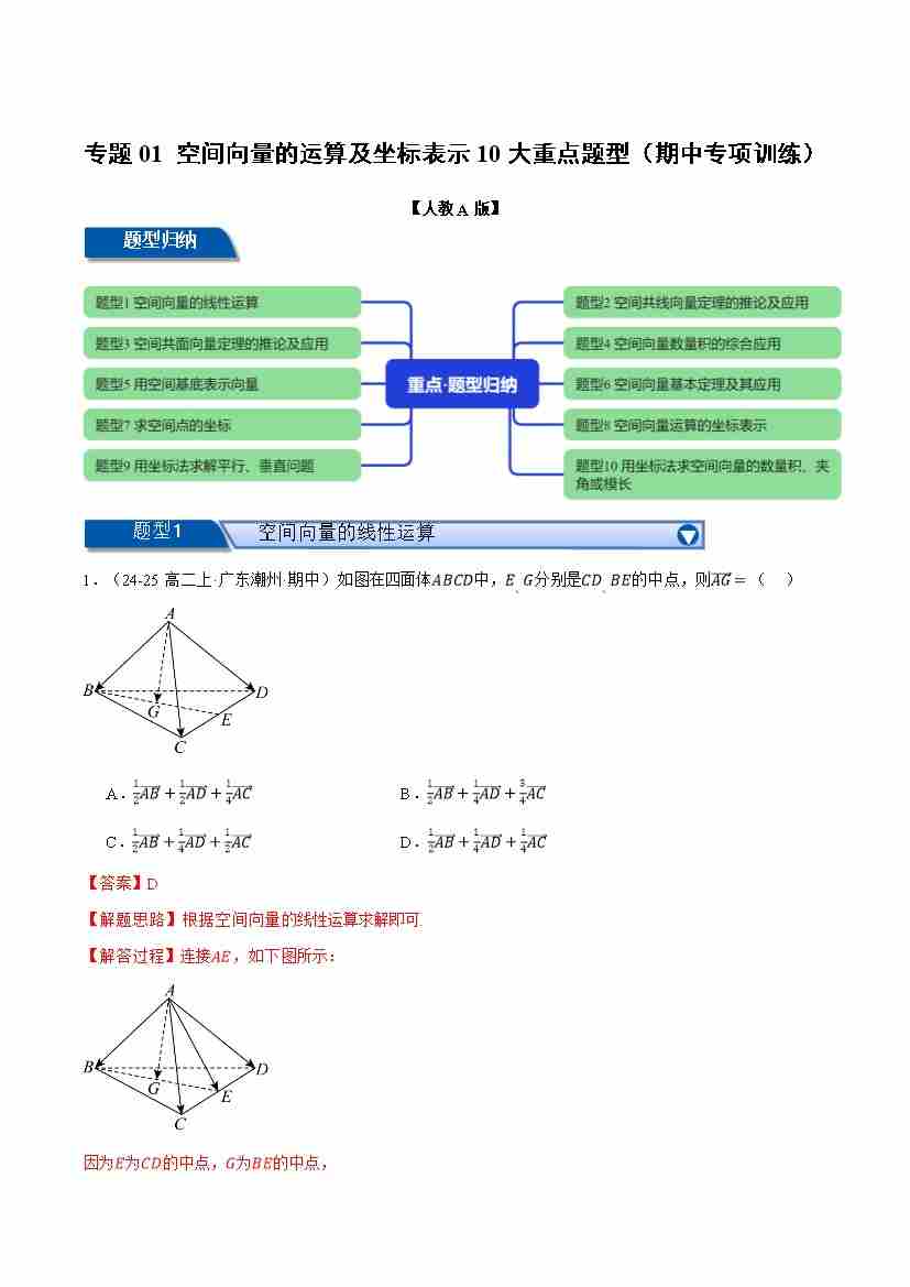 专题01 空间向量的运算及坐标表示10大重点题型(举一反三期中专项训练)(教师版)