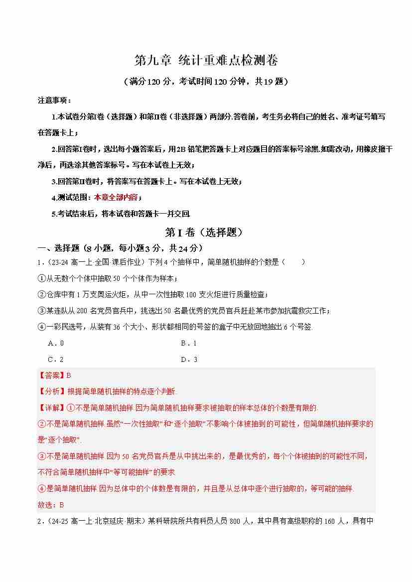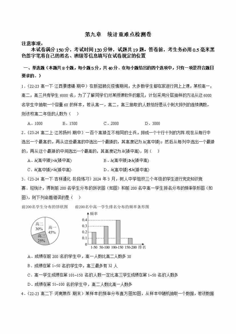 第九章 统计重难点检测卷 (学生版)