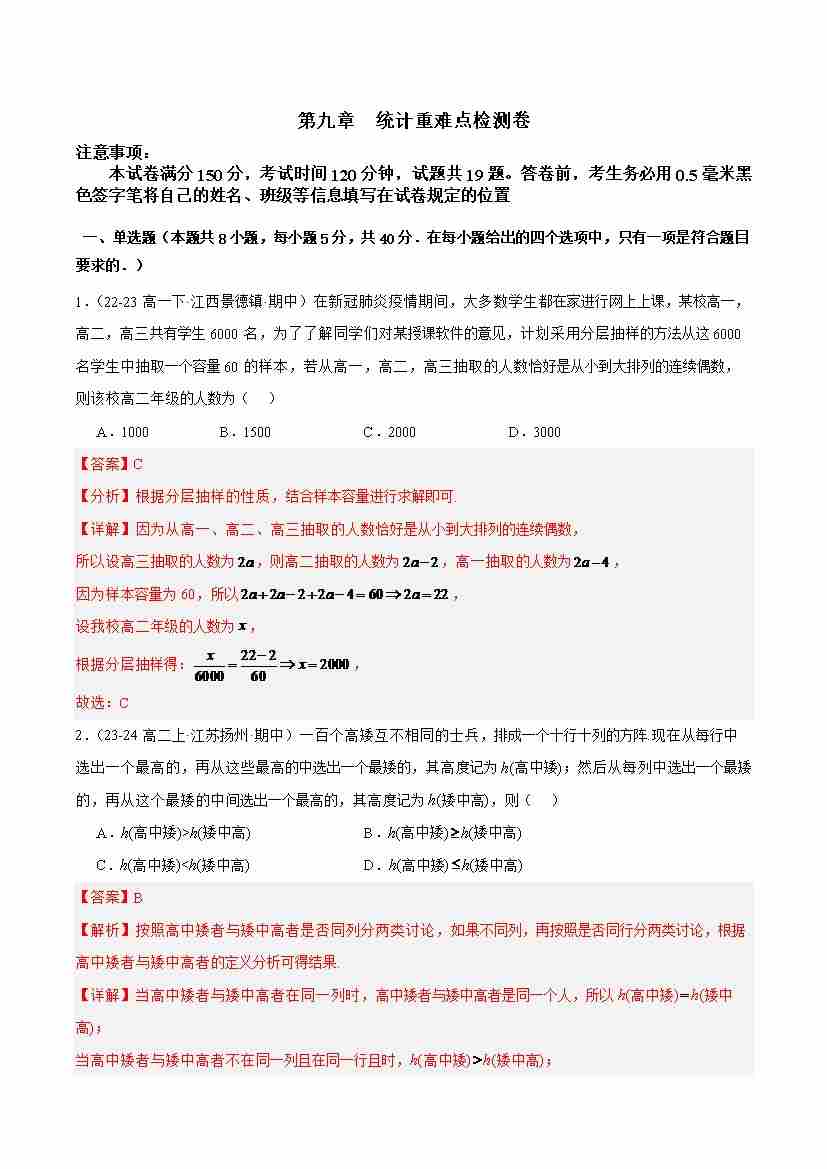 第九章 统计重难点检测卷 (教师版)