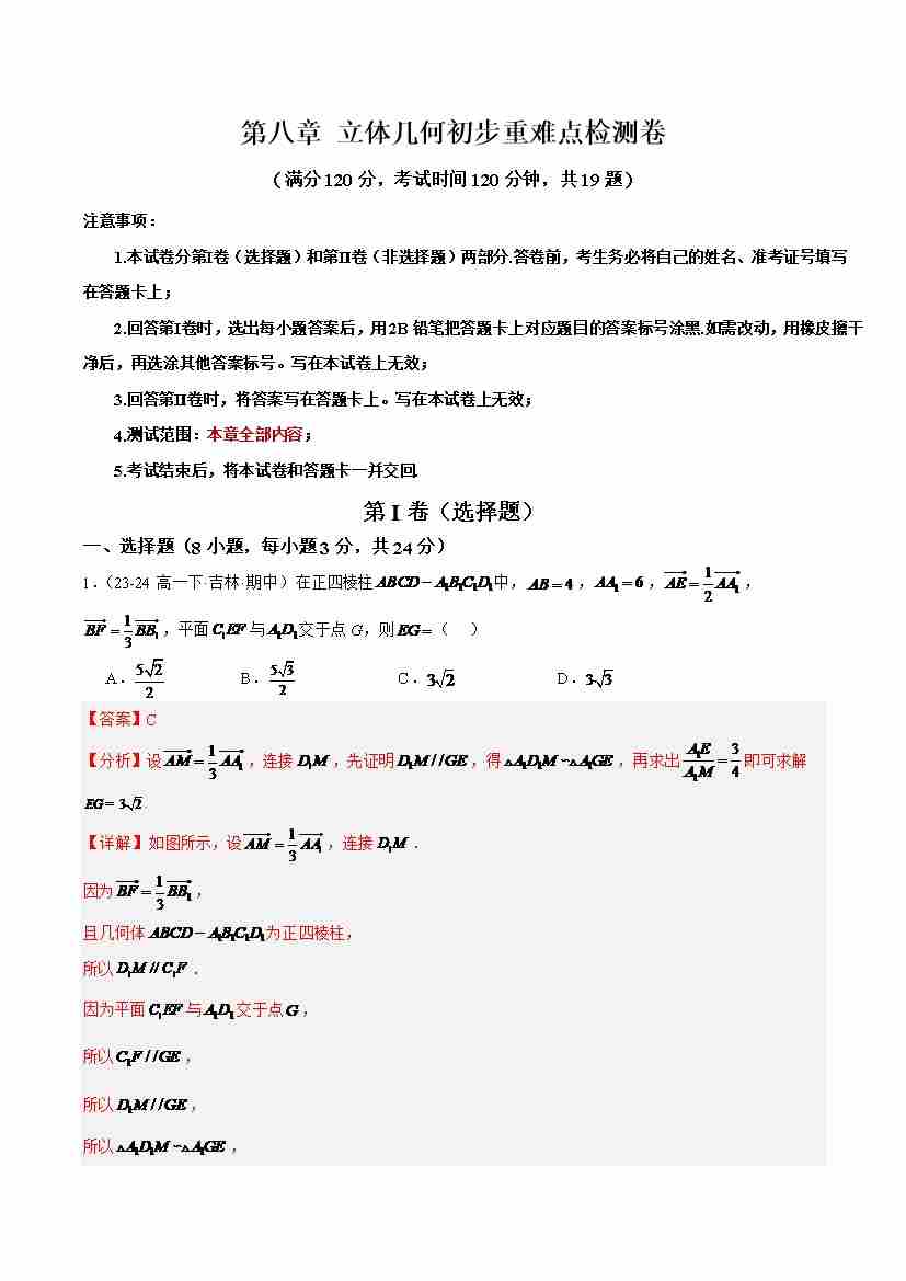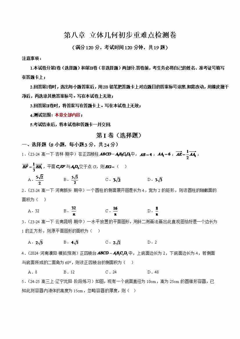 第八章 立体几何初步重难点检测卷 (学生版)