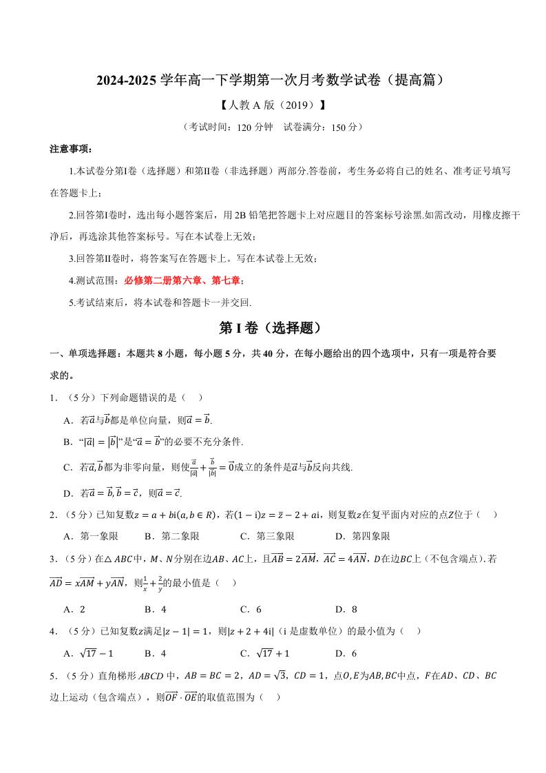 高一下学期第一次月考数学试卷(提高篇)(学生版)