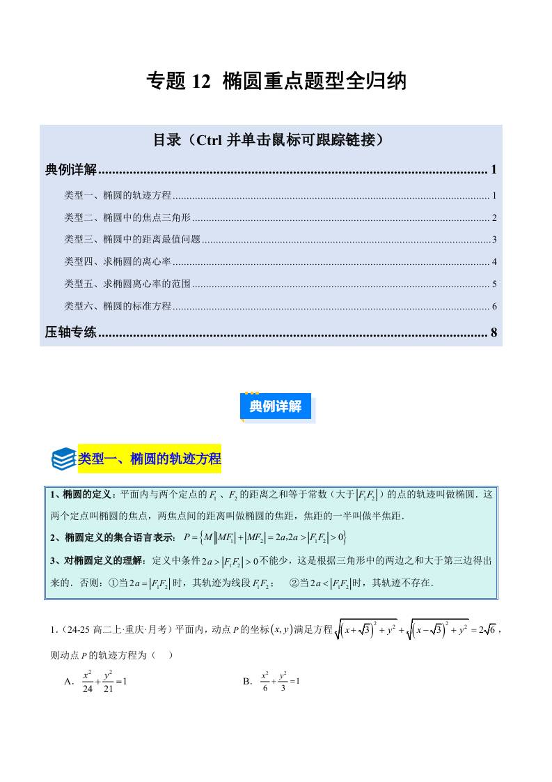 专题12 椭圆重点题型全归纳(压轴题6大类型专项训练)(学生版)