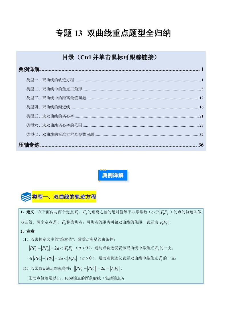 专题13 双曲线重点题型全归纳(压轴题7大类型专项训练)(学生版)