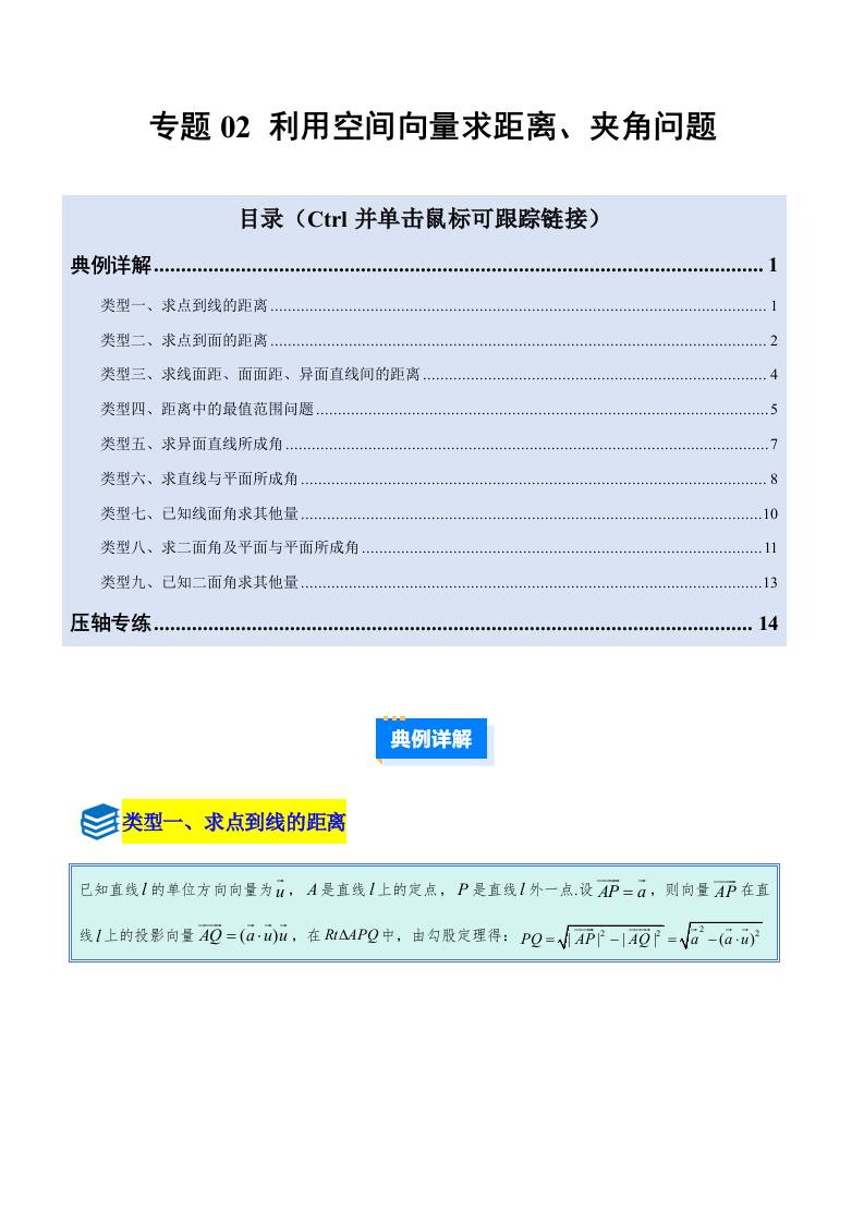 专题02 利用空间向量求距离、夹角问题(压轴题9大类型专项训练)(学生版)