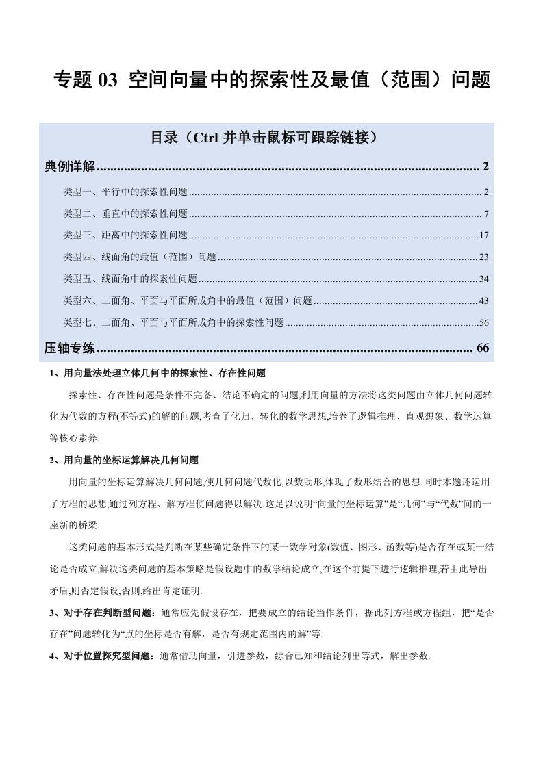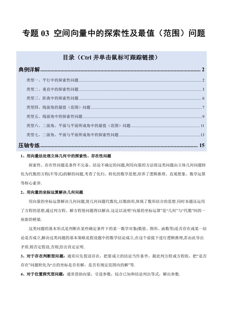 专题03 空间向量中的探索性及最值(范围)问题(压轴题7大类型专项训练)(学生版)