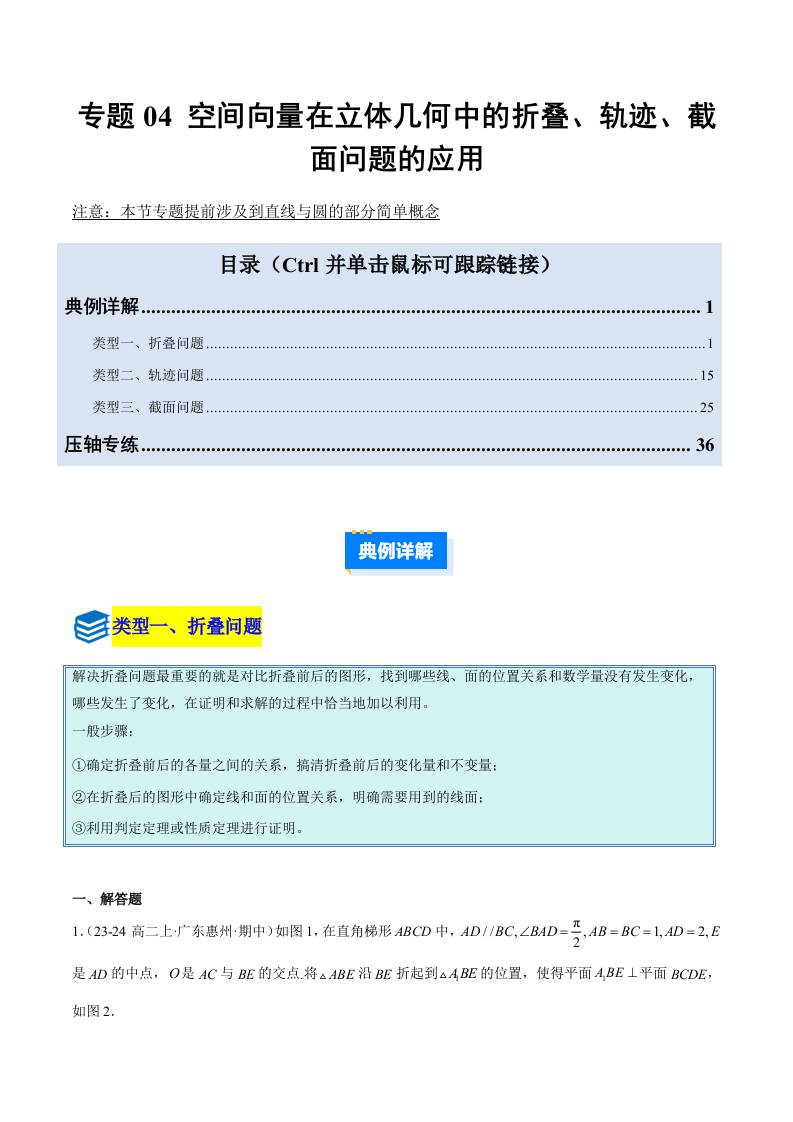 专题04 空间向量在立体几何中的折叠、轨迹、截面问题的应用(压轴题3大类型专项训练)(学生版)