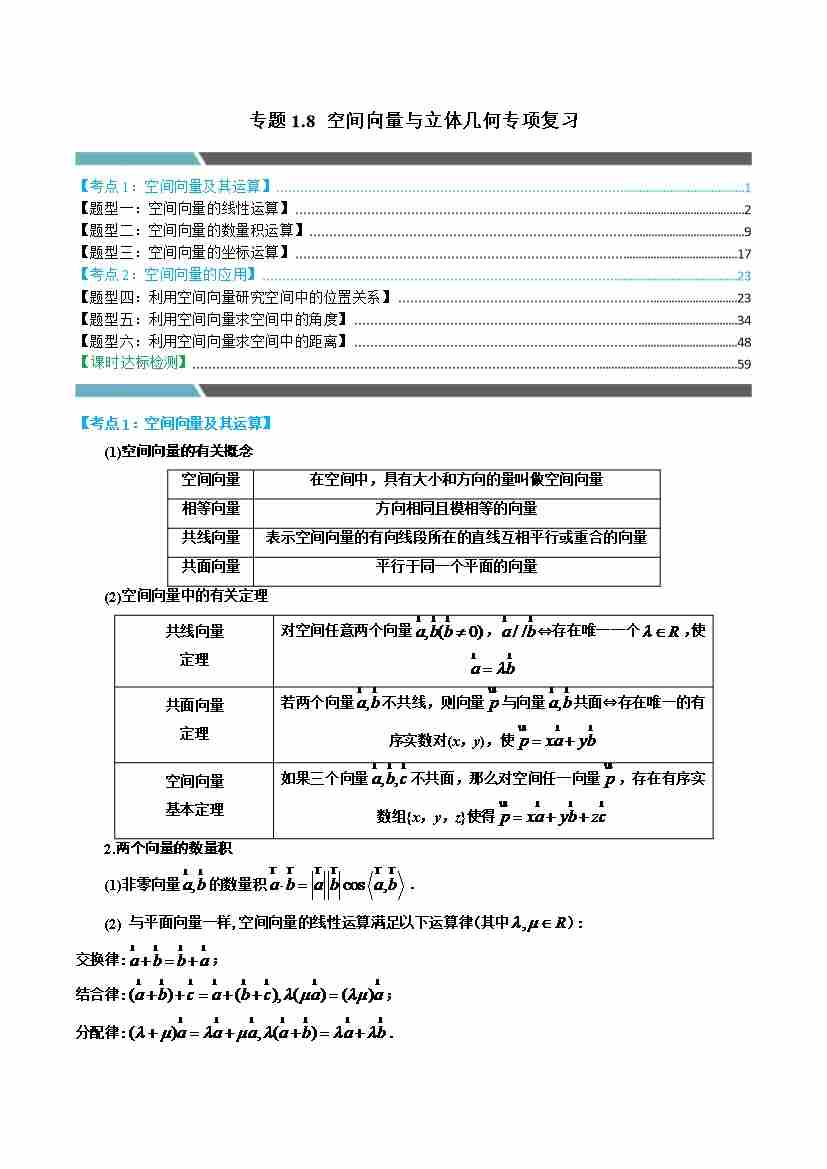 专题1.8 空间向量与立体几何专项复习(2大考点6种题型)(学生版)